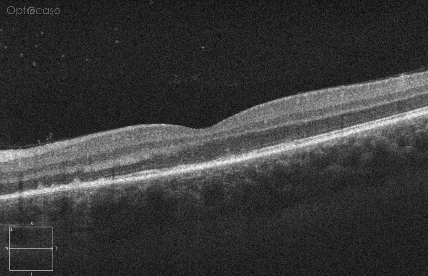 In the vitreous there is a dusting of hyperreflective spots. This is consistent with a low-grade posterior vitritis. In the deep retina, there is thinning of the external limiting membrane and disruption of the ellipsoid zone. There is also hyperreflectivity at the level of the RPE. This corresponded to a series of deep white retinal lesions (video).